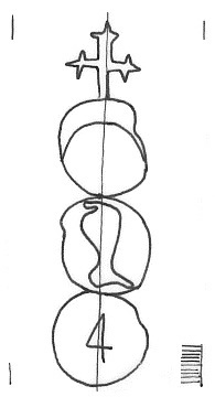 DescripciónTres círculos surmontados por una cruz. En el 1º una media luna, 2º una pierna. 3º número.