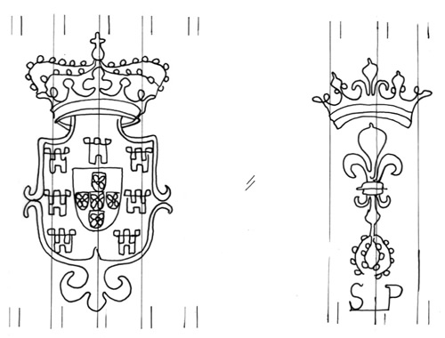 DescripciónEscudo de armas de Portugal. Derecha flor de lis sobre iniciales del fabricante.