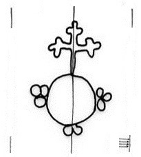 DescripciónUn círculo surmontado por una cruz y rodeado de grupos de tres circulitos.