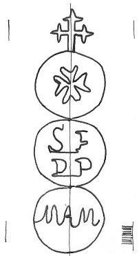 DescripciónTres círculos surmontados por una cruz. En el 1º una cruz de Malta, 2º y 3º iniciales.