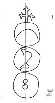 DescripciónTres círculos surmontados por una cruz. En el 1º una media luna, 2º una pierna. 3º número.