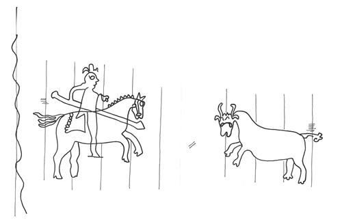 DescripciónPicador o rejoneador de toros portando una lanza. Derecha el toro.