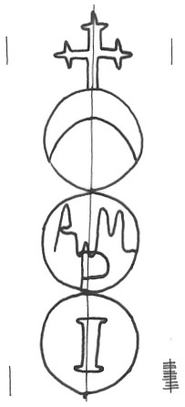 DescripciónTres círculos surmontados por una cruz. En el 1º una media luna, 2º iniciales 3º número.