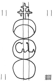 DescripciónTres círculos surmontados por una cruz. En el 1º una media luna, 2º iniciales.