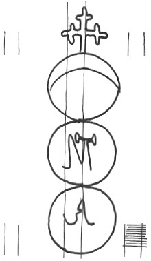 DescripciónTres círculos surmontados por una cruz. En el 1º una media luna, 2º monograma, 3º inicial.