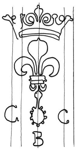 DescripciónLis coronada con iniciales en laterales y al pie.