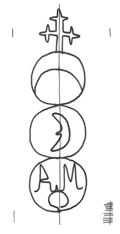 DescripciónTres círculos surmontados por una cruz. En el 1º una media luna, 2º media luna y 3º iniciales.