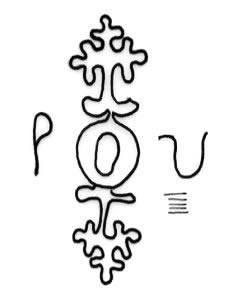 DescripciónDos cruces treboladas unidas verticalmente por un doble círculo o una O y dos iniciales.