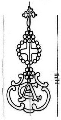 DescripciónCruz dentro de una cadena, surmontado por otra cruz sobre monograma entre filetes.