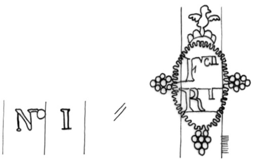 | Número - Codigo | B0886 - U. Figuras geométricas | | Codigo2 | D. Aves | | Descripción | Ovalo en serpentina con tres grupos de circulitos,surmontado por un pájaro, en el centro iniciales del fabricante, izquierda nº 1. | | Iniciales | Nº I Fc RI | | Dimensión | 12/32 = 84/58 | | Distancia corondeles | 23/23 = 23 mm. | | Puntizones | 10 = 10 | | Fabricante | Romani i Soteras, Francisco | | Lugar | Cataluña | | Depositario | A.H.P.M. - Archivo Histórico Provincial de Málaga (España) | | Tipo documento | Manuscrito | | Autor | Rafael de Guevara | | Título | Protocolo | | Impresor | -- | | Lugar impresion | -- | | Legajo | P.4735 | | Folio | 139/140 Libro 2 | | Dimensiones doc. | A 316/ An 434 | | Espesor papel | E 0,10 | | Procedencia | Nerja - Málaga | | Fecha documento | 1811 | | | | | n  | | | | |
