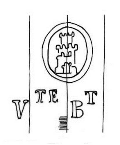 DescripciónTorre de dos tramos inscrita en un doble círculo, en la base abreviaturas del fabricante.