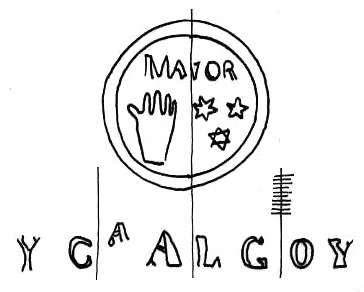 DescripciónMano, tres estrella de 6 puntas y apellido del gabricante inscrtos dentro de un doble círculo. En la base topónimo.