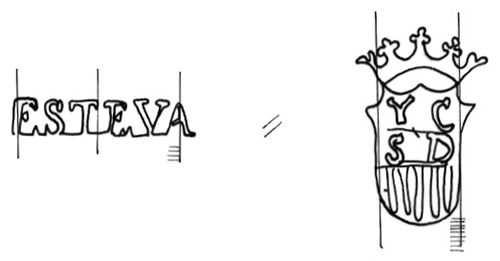 DescripciónEscudo coronado con iniciales sobre barras. A la izquierda apellido del fabricante.