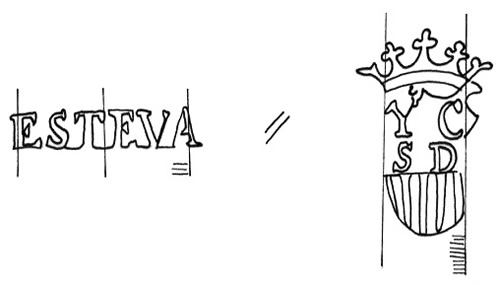 DescripciónEscudo coronado con iniciales sobre barras. A la izquierda apellido del fabricante.