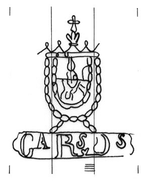 DescripciónEscudo con eslabones con corona y cruz. Al pie cartela con iniciales.