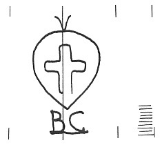 DescripciónUna cruz surmontada por una inicial. Dentro un corazón o escudo. Al pie iniciales.