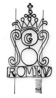 DescripciónDos círculos coronados con filetes laterales: inicial en el 1º, en la cartela de base apellido del fabricante.