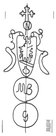 DescripciónEscudo surmontado por una cruz con un águila coronado en el cuerpo, sobre dos círculos con iniciales en el primero y número en el segundo.
