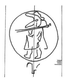DescripciónPeregrino dentro de un círculo. Al pie iniciales.