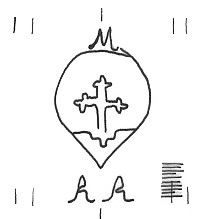 DescripciónUna cruz surmontada por una inicial. Dentro un corazón o escudo. Al pie iniciales.
