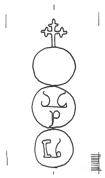 DescripciónTres círculos surmontados por una cruz, 2º monograma. 3º número y signo.