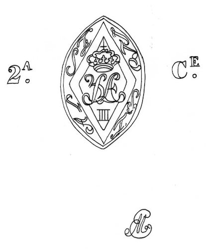 DescripciónCorona sobre monograma dentro de un doble triángulo, incluido en un óvalo con iniciales. En los laterales calidad del papel. Abajo Monograma EM