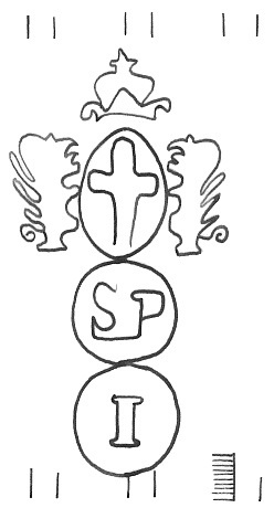 DescripciónEscudo de Génova sobre dos círculos. 1º iniciales. 2º número.