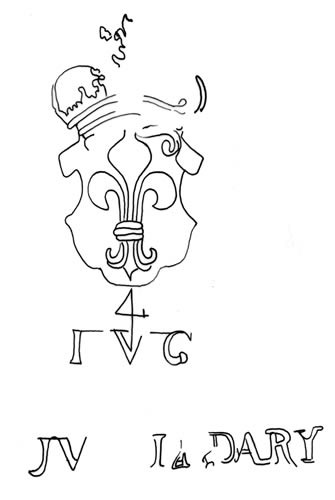 DescripciónEscudo con flor de lis en el campo al pie iniciales.