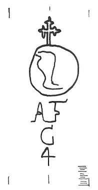 DescripciónUn círculo surmontado por una cruz. En el 1º una pierna. Al pie iniciales y número.