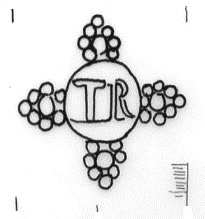 DescripciónUn círculo con grupos de circulitos, en centro monograma del fabricante.