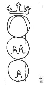 DescripciónTres círculos surmontados por una cruz lombarda o tridente. En el 1º, una media luna, 2º y trecero iniciales.