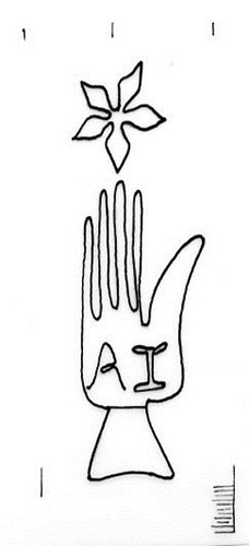 DescripciónMano surmontada por una flor con iniciales en las palma.