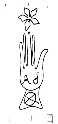 DescripciónMano surmontada por una flor con iniciales en las palma.