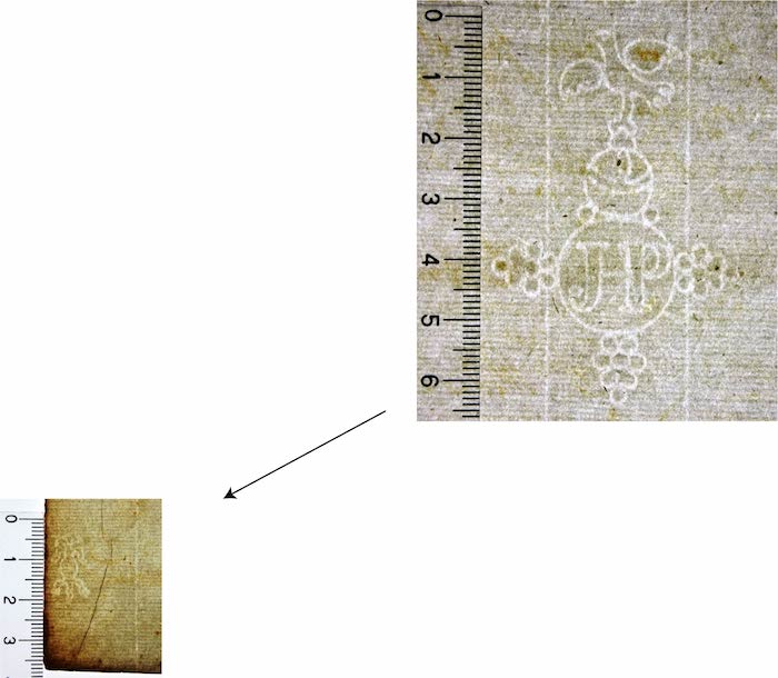 DescripciónCírculo con 3 grupos de circulitos en el exterior, con monograma del fabricante en el interior, surmontado por una paloma sobre un orbe. En el centro del pliego abajo un puerro pequeño como contramarca.