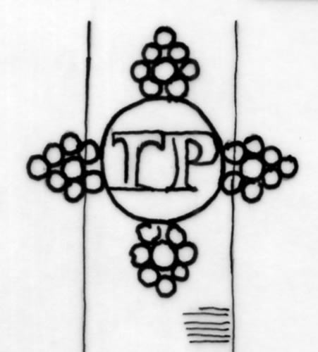 DescripciónUn círculo con grupos de circulitos, en centro monograma del fabricante.