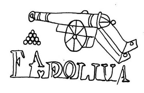 DescripciónCañón montado en su cureña, a la derecha un grupo de balas, al pie nombre del fabricante.