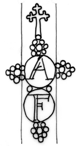 DescripciónDos círculos una iniciales dentro cada uno, con grupos de circulitos en el exterior y surmontado por una cruz.