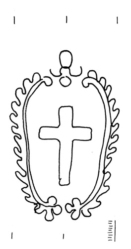 DescripciónCruz dentro de una guirnalda sumortada por una flor.