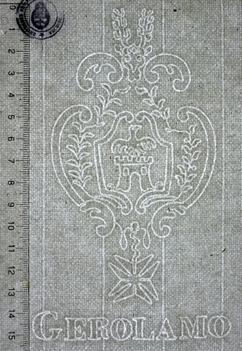 Escudo formado por filetes y guirnarda de hojas terminada en una cruz de Malta, surmontado por cabeza de ciervo. En el campo una torre surmontada por un ave con alas abiertas. Al pie nombre del fabricante.