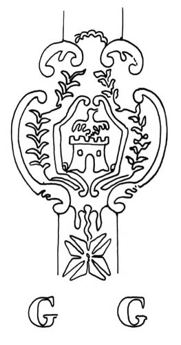 Escudo formado por filetes y guirnarda de hojas terminada en una cruz de Malta, surmontado por cabeza de ciervo. En el campo una torre surmontada por un ave con alas abiertas. Al pie iniciales del fabricante.