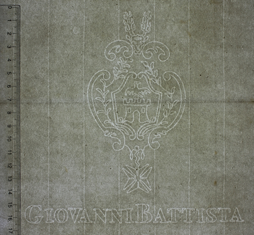 Escudo formado por filetes y guirnarda de hojas terminada en una cruz de Malta, surmontado por cabeza de ciervo. En el campo una torre surmontada por un ave con alas abiertas. Al pie nombre y apellido del fabricante.