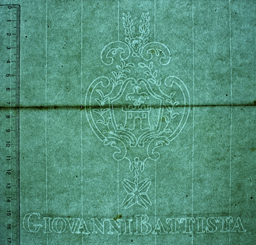 Escudo formado por filetes y guirnarda de hojas terminada en una cruz de Malta, surmontado por cabeza de ciervo. En el campo una torre surmontada por un ave con alas abiertas. Al pie nombre y apellido del fabricante.