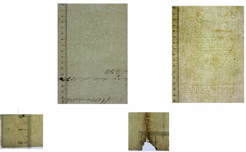 | Descripción | Escudo formado por filetes y guirnarda de hojas terminada en una cruz de Malta, surmontado por cabeza de ciervo. En el campo una torre surmontada por un ave con alas abiertas. Al pie nombre del fabricante. Derecha la república portando una palma en la mano, recostada sobre un pedestal con el topónimo dentro de una cartela con ornamentos. Al pie Apellido del fabricante y un número. En la base izquierda un número, al centro Inicial. |