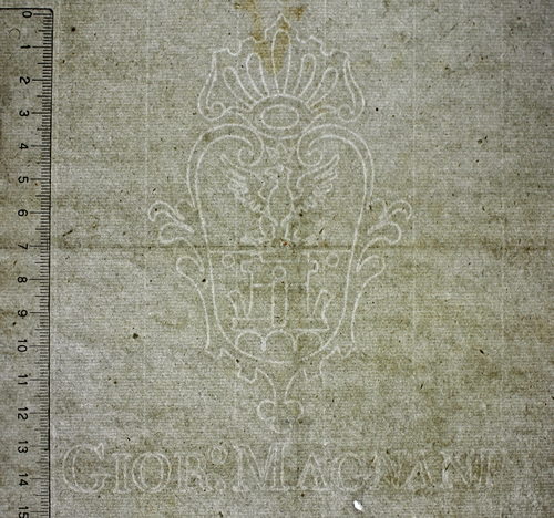 | Número - Codigo | B1878 - T. Flor de Lis. Emblemas heráldicos y escudos | | Codigo2 | W. Nombres, apellidos, topónimos y palabras | | Descripción | Escudo coronado, en el cuerpo hay una torre, sobre tres montes, surmontado por un águila con alas extendidas y coronada. Al pie Nombre abreviado y apellido del fabricante. | | Iniciales | -- | | Dimensión | 145/131 | | Distancia corondeles | 27 mm. | | Puntizones | 12 | | Corondeles portadores | 2 | | Fabricante | Magnani, Giorgio | | Lugar | Pescia - Italia | | Depositario | Particular | | Tipo documento | -- | | Autor | -- | | Título | -- | | Impresor | -- | | Lugar impresion | -- | | Legajo | -- | | Folio | Blanca | | Dimensiones doc. | A 305/ An 207 | | Espesor papel | E --- | | Procedencia | Buenos Aires | | Fecha documento | 1831 | | | | | n  | | | | |