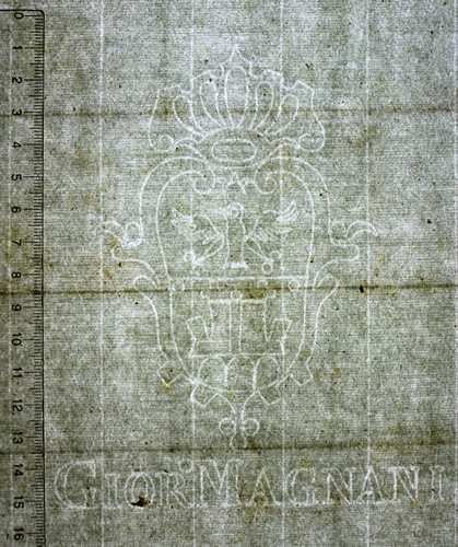 | Número - Codigo | B1879 - T. Flor de Lis. Emblemas heráldicos y escudos | | Codigo2 | W. Nombres, apellidos, topónimos y palabras | | Descripción | Escudo coronado, en el cuerpo hay una torre, sobre tres montes, surmontado por un águila con alas extendidas y coronada. Al pie Nombre abreviado y apellido del fabricante. | | Iniciales | -- | | Dimensión | 144/124 | | Distancia corondeles | 28 mm. | | Puntizones | 12 | | Corondeles portadores | 2 | | Fabricante | Magnani, Giorgio | | Lugar | Pescia - Italia | | Depositario | Particular | | Tipo documento | -- | | Autor | -- | | Título | -- | | Impresor | -- | | Lugar impresion | -- | | Legajo | -- | | Folio | Blanca | | Dimensiones doc. | A 313/ An 216 | | Espesor papel | E --- | | Procedencia | Buenos Aires | | Fecha documento | -- | | | | | n  | | | | |