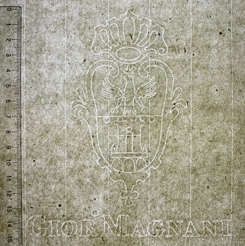 | Número - Codigo | B1881 - T. Flor de Lis. Emblemas heráldicos y escudos | | Codigo2 | W. Nombres, apellidos, topónimos y palabras | | Descripción | Escudo coronado, en el cuerpo hay una torre, sobre tres montes, surmontado por un águila con alas extendidas y coronada. Al pie Nombre abreviado y apellido del fabricante. | | Iniciales | -- | | Dimensión | 149/135 | | Distancia corondeles | 27/28/27/27/28 mm. | | Puntizones | -- | | Corondeles portadores | 4 | | Fabricante | Magnani, Giorgio | | Lugar | Pescia - Italia | | Depositario | Particular | | Tipo documento | -- | | Autor | -- | | Título | -- | | Impresor | -- | | Lugar impresion | -- | | Legajo | -- | | Folio | Blanca | | Dimensiones doc. | Medio Pliego | | Espesor papel | -- | | Procedencia | Buenos Aires | | Fecha documento | -- | | | | | n  | | | | |