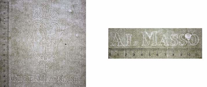 | Número - Codigo | B1883 - T. Flor de Lis. Emblemas heráldicos y escudos | | Codigo2 | W. Nombres, apellidos, topónimos y palabras | | Descripción | Escudo coronado, en el cuerpo hay una torre, sobre tres montes, surmontado por un águila con alas extendidas y coronada. Al pie Nombre abreviado y apellido del fabricante. A la derecha nombre de la fábrica. | | Iniciales | -- | | Dimensión | 150/134 = 17/102 | | Distancia corondeles | 27 = 27 mm. | | Puntizones | -- | | Fabricante | Magnani, Giorgio | | Lugar | Pescia - Italia | | Depositario | Particular | | Tipo documento | -- | | Autor | -- | | Título | -- | | Impresor | -- | | Lugar impresion | -- | | Legajo | -- | | Folio | Blanca | | Dimensiones doc. | A 315/ An 420 | | Espesor papel | E --- | | Procedencia | Buenos Aires | | Fecha documento | -- | | | | | n  | | | | |