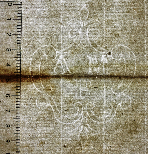 DescripciónEscudo formado con filetes y lises en el interior iniciales del fabricante.
