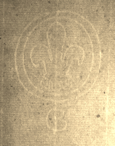 DescripciónFlor de lis inscrita de un doble círculo sobre un monograma.