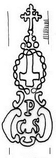 DescripciónCruz dentro de una cadena, surmontado por otra cruz sobre iniciales entre filetes.